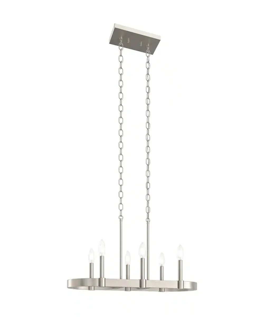 - FINISH - Brushed Nickel finish enhance the look of clean and minimalist style decors. Rounded edge design lends a unique visual contrast to a traditional linear chandelier. Place over a kitchen island or over a dining table for a classic, clean look.
